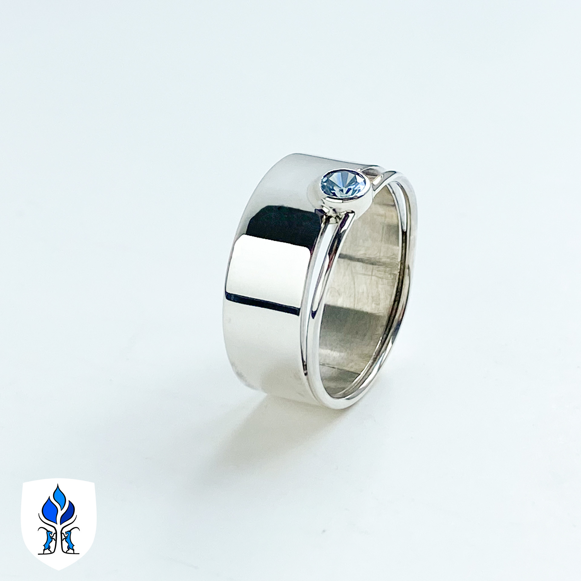 Zilver met een blauwe zirkonia steen.